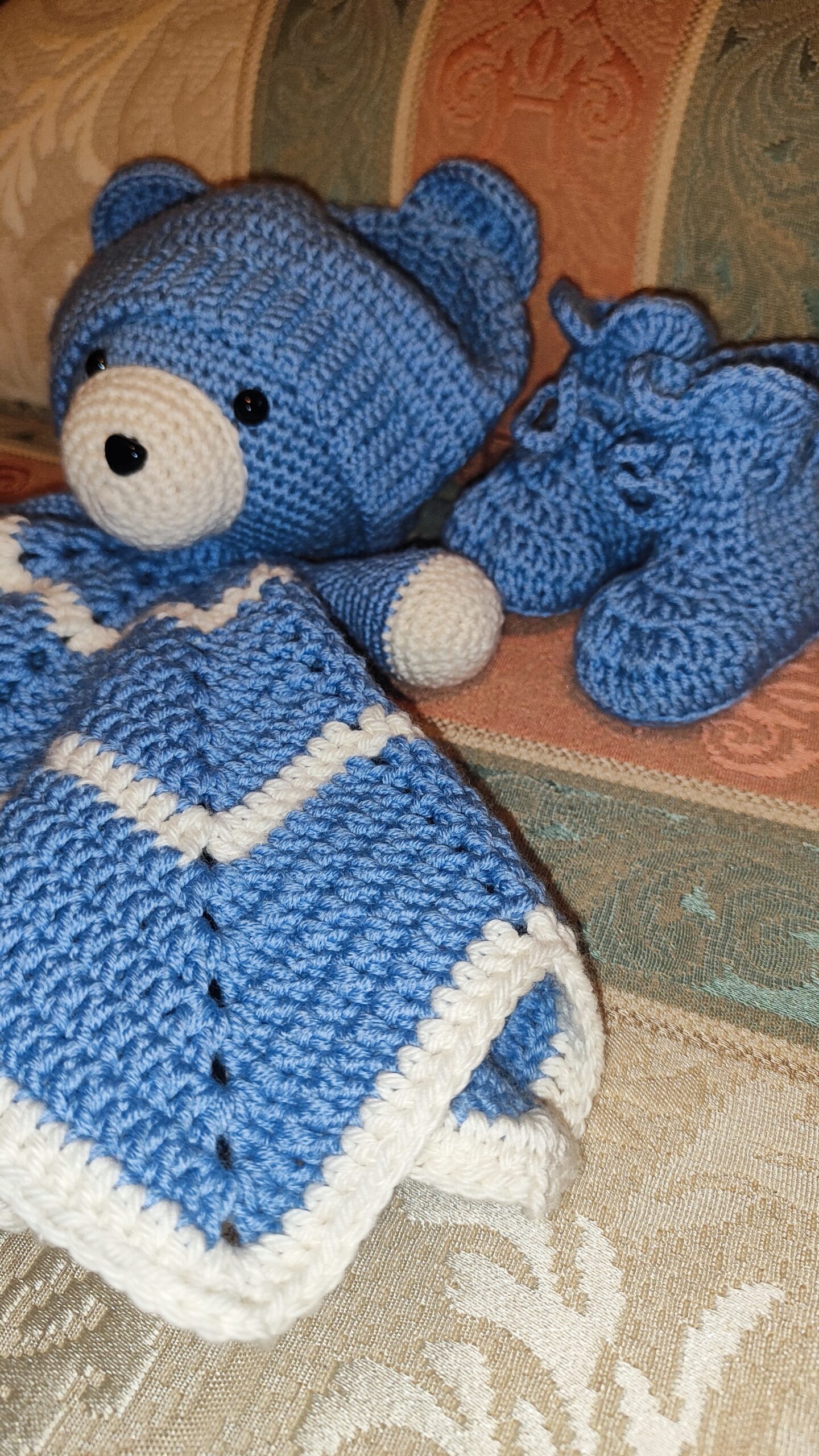 Jedinstveni set: Uz medvedića i ćebe, dobijate i par ručno pletenih patofnica koje savršeno dopunjuju ovaj predivni set. Patofnice su dizajnirane da pružaju maksimalnu udobnost i toplinu malim stopalima.